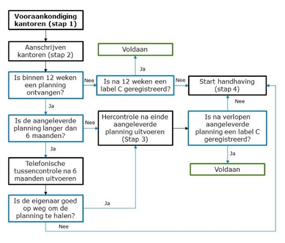 Op 4 november 2022 heeft het Informatiepunt Leefomgeving (IPLO) namelijk gemeenten geadviseerd hoe met de handhaving kan worden omgegaan (Uitvoeren toezicht bij energielabel C voor kantoren - Informatiepunt Leefomgeving (iplo.nl)). De eerste drie stappen (vooraankondiging, controle en hercontrole – zowel gericht op verhuurders als huurders) zijn verder uitgewerkt in een stroomdiagram: